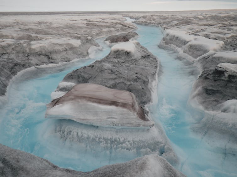 A highly darkened surface of the Greenland ice sheet, rich in algae and incised with rivers of meltwater.