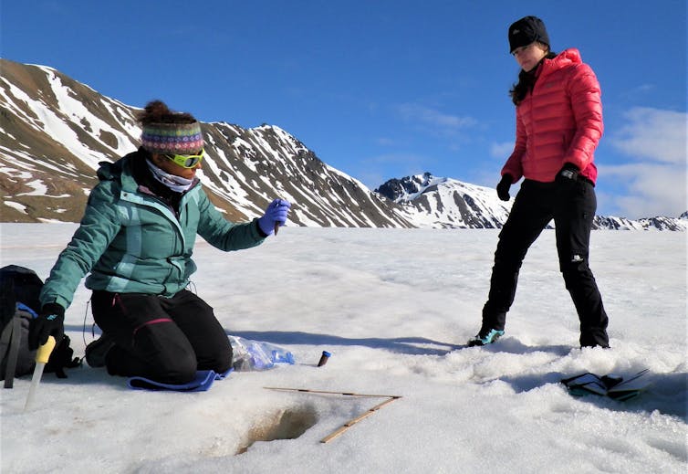 Aliyah Debbonaire (left) and Melanie Hay sampling a cryoconite hole.