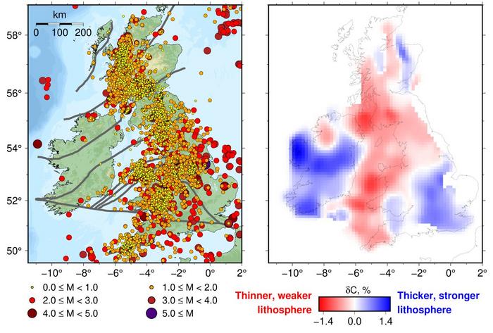 Peer-Reviewed PublicationIMAGE: EARTHQUAKE OCCURRENCES ACROSS BRITAIN AND IRELAND (LEFT) CORRESPOND TO DIFFERENCES IN LITHOSPHERE THICKNESS (RIGHT). view more