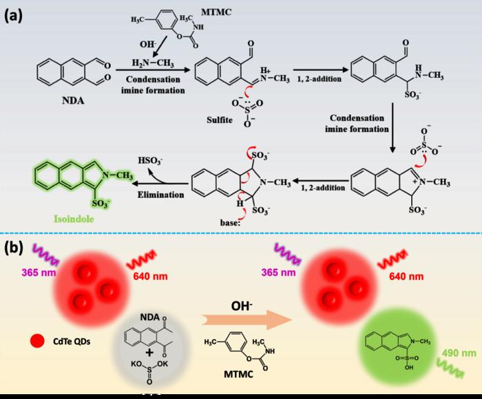 In this study, researchers developed an enzyme-free fluorescence probe using CdTe quantum dots (CdTe QD) as a background fluorescence to visually detect carbamate pesticides (CPs). The probe was based on the principle of 2,3-naphthalaldehyde (NDA) and sulfite-induced Strecker reactions. Upon the addition of CPs, a nucleophilic condensation reaction occurred, resulting in the production of green fluorescent isoindole. This reaction caused a distinct color change from red to green, allowing for rapid visual detection of carbamates. The probe exhibited a low detection limit (LOD) of 18.6 nM, which is below the national maximum residue standard.