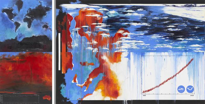 Peer-Reviewed PublicationIMAGE: A PAINTING BY DIANE BURKO ENTITLED "SUMMER HEAT, 2020" DEPICTS RED, ORANGE AND BLUE MOTIFS OF WILDFIRES AND MELTING GLACIERS THAT OVERLAP WITH MAPS THAT APPEAR TO DRIP OVER A GRAPH OF GLOBAL ATMOSPHERIC CARBON DIOXIDE LEVELS. RESEARCH FROM THE UNIVERSITY OF WISCONSIN–MADISON HAS SHOWN THAT COMBINING CLIMATE DATA WITH VISUALLY ENGROSSING ART CAN MAKE DATA MORE MEANINGFUL TO VIEWERS AND BRIDGE POLITICAL DIVIDES RELATED TO CLIMATE SCIENCE. view more