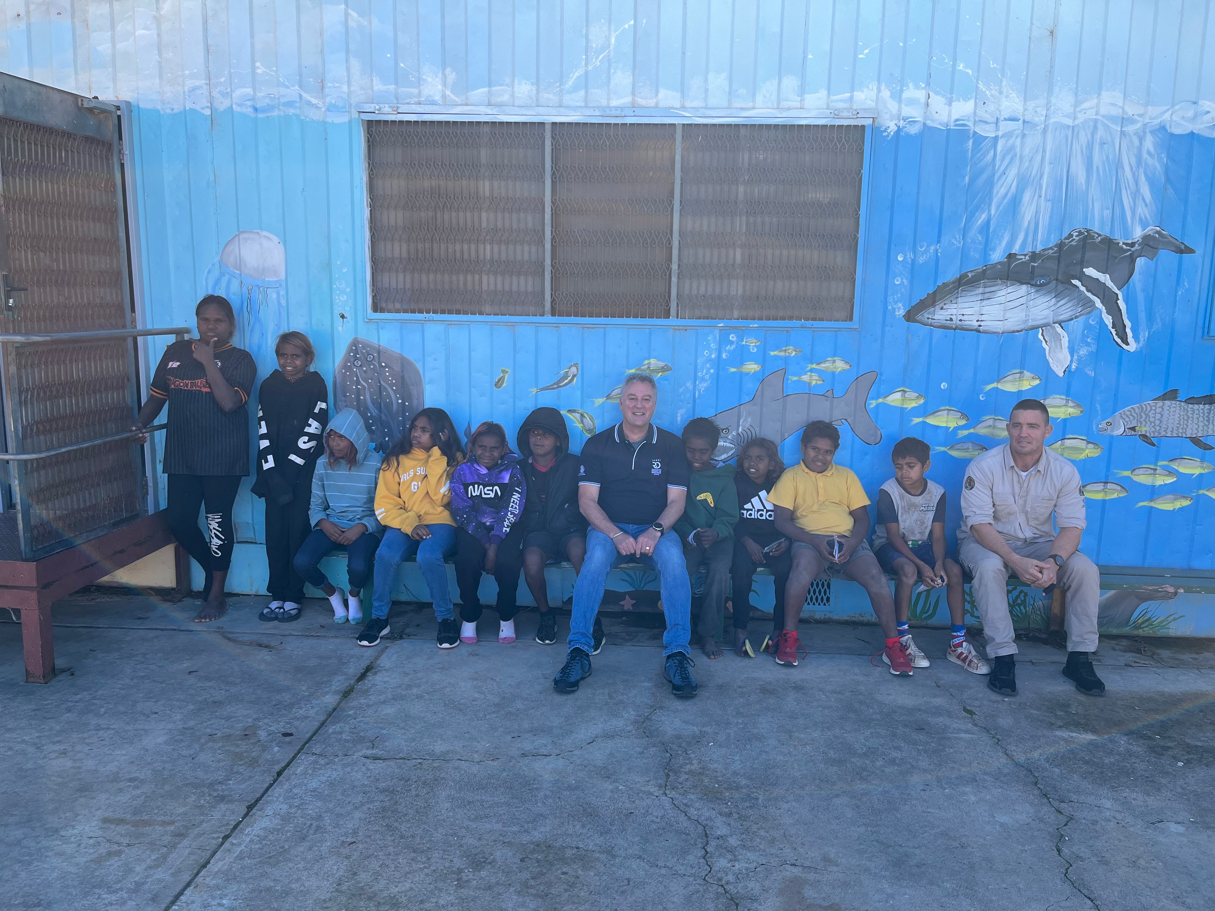 Professor Goldsworthy [C] and Western Eyre Marine Park manager Dirk Holman with Yalata students.(Supplied)