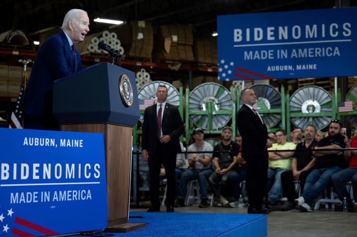 “Earlier this week, the Washington Post suggested Republicans may have to find something else to criticize me for, now that inflation is coming down,” the president said as he gave a speech at Auburn Manufacturing Inc., a textile company in Auburn, Maine.