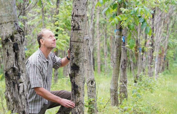 Peer-Reviewed PublicationIMAGE: DOUGLASS JACOBS, THE FRED M. VAN ECK PROFESSOR OF FOREST BIOLOGY AT PURDUE UNIVERSITY, WITH A BUTTERNUT TREE THAT HAS BEEN INFECTED WITH STEM CANKER. BUTTERNUT IS ON THE LIST OF AT-RISK FOREST TREE SPECIES THAT WILL LIKELY NEED BIOTECHNOLOGY ALONG WITH TRADITIONAL TREE-BREEDING APPROACHES TO AVOID EXTINCTION. view more