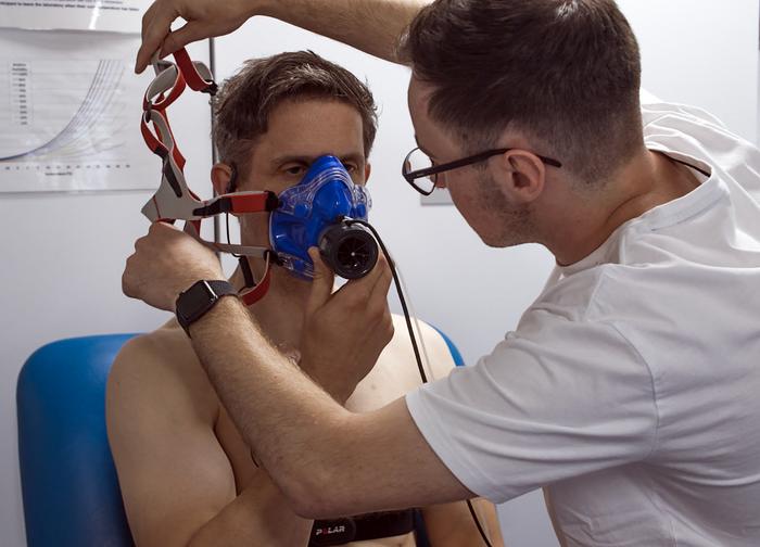 IMAGE: PROFESSOR LEWIS HALSEY AS A PARTICIPANT IN AN EXPERIMENT LED BY PHD STUDENT CHRIS WOLFE. THE EXPERIMENT PRIMARILY INVOLVES COMPARING THE PARTICIPANT’S RESTING METABOLIC RATE AT ROOM TEMPERATURE AND AT 50C (WITH 25% HUMIDITY). SKIN AND RECTAL TEMPERATURE ARE ALSO RECORDED, AS IS HEART RATE. view more