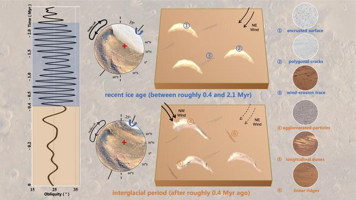 The team found that the prevailing wind direction on the southern Utopian Plain shifted nearly 70° from northeast to northwest, eroding crescent-shaped dunes formed during the last glacial period into dark, longitudinal ridges after the last Martian ice age.