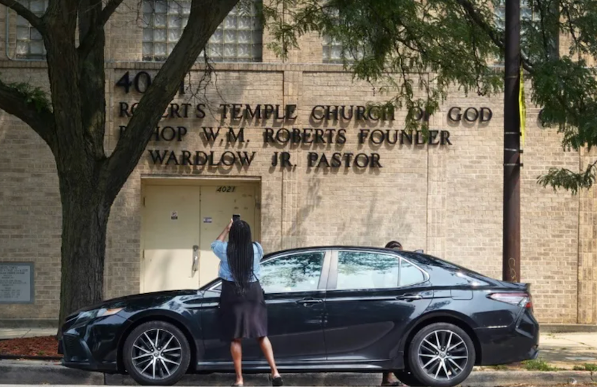 A woman takes a picture of the Roberts Temple Church of God in Christ in Chicago, which will be designated by the White House as part of a three-part memorial to Emmett Till, a 1955 lynching victim