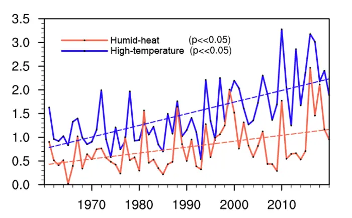 Against the background of global warming, significant increasing trends in the frequency of such extreme events are captured nationwide, but with much stronger trends detected in northern and western China (see figure). According to this study, the anomalies of humidity play a more important role than those of temperature in the occurrence of extreme compound humid-heat events in most parts of China, but particularly in eastern regions. Since 1961, the human population and land areas of China have experienced strongly increasing compound heat extremes, with a faster rate of exposure to extreme compound humid-heat events than to extreme compound high-temperature events.