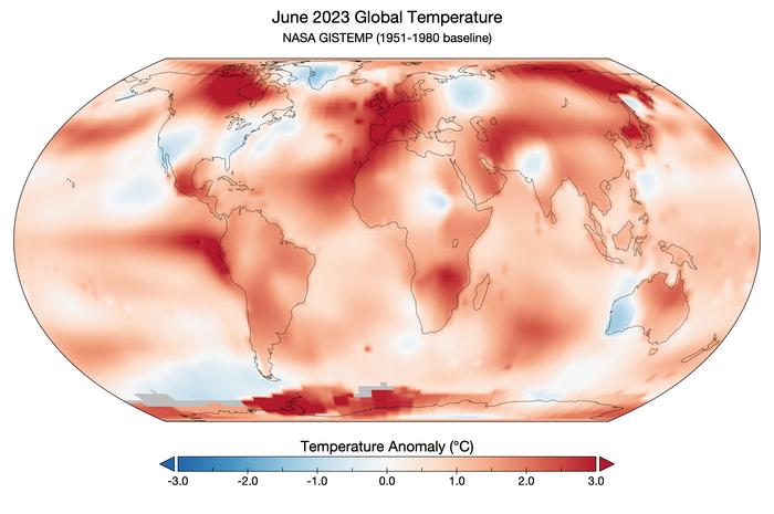 IMAGE: THIS MAP SHOWS GLOBAL TEMPERATURE ANOMALIES FOR JUNE 2023 ACCORDING TO THE GISTEMP ANALYSIS BY SCIENTISTS AT NASA’S GODDARD INSTITUTE FOR SPACE STUDIES. TEMPERATURE ANOMALIES REFLECT HOW JUNE 2023 COMPARED TO THE AVERAGE JUNE TEMPERATURE FROM 1951-1980. view more