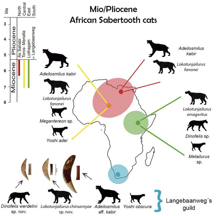 The study described a total of four species. Two of these species, Dinofelis werdelini and Lokotunjailurus chimsamyae, were previously unknown. Dinofelis sabertooths are globally distributed, and their fossils have been found in Africa, China, Europe, and North America. The researchers were expecting to identify a new Dinofelis species from Langebaanweg based on prior research. However, Lokotunjailurus has only ever been identified in Kenya and Chad before this analysis. This suggests that they may have been distributed all throughout Africa between 5–7 million years ago.