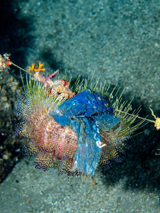 IMAGE: THIS FIRE URCHIN (ASTHENOSOMA VARIUM) IS HANGING ON TO A FISHING LINE WHILE CAMOUFLAGING ITSELF WITH A PIECE OF A BLUE PLASTIC BAG AT ABOUT 130-M DEPTH IN THE PHILIPPINES. THESE URCHINS USUALLY PICK UP BLADES OF SEAGRASS OR SMALL PIECES OF RUBBLE TO BLEND IN WITH THE BOTTOM, BUT THIS ONE PICKED UP A PIECE OF PLASTIC. (LUIZ ROCHA © CALIFORNIA ACADEMY OF SCIENCES) view more