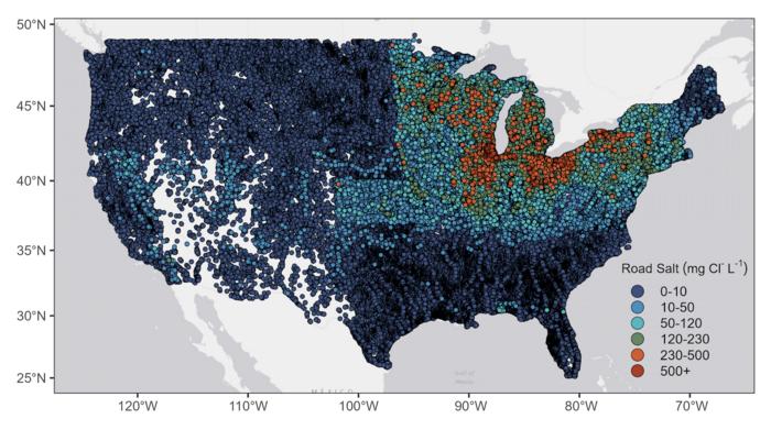 IMAGE: THE MODEL’S PREDICTIONS FOR WHERE ROAD SALT CONCENTRATIONS WILL STABILIZE IN 461,567 LAKES AND RESERVOIRS LARGER THAN 2.5 ACRES. EACH POINT ON THE MAP REPRESENTS A LAKE OR RESERVOIR. THE PREDICTIONS ASSUME THAT ROAD DENSITY AND SALT APPLICATION RATE PER UNIT OF ROAD REMAIN CONSTANT AT MEAN 2010-2015 LEVELS. view more
