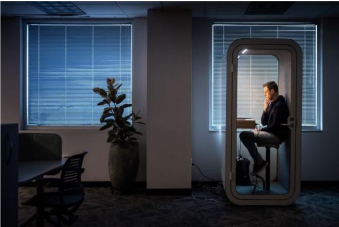 Business AnnouncementIMAGE: MATTHEW-RYAN MORRELL, STRATEGIC SITE PLANNING MANAGER, USES A SOUNDPROOF BOOTH TO PARTICIPATE IN A TEAMS MEETING AT THE COLLABORATION SPACE IN IPOC AT SANDIA NATIONAL LABORATORIES. (PHOTO BY CRAIG FRITZ) view more