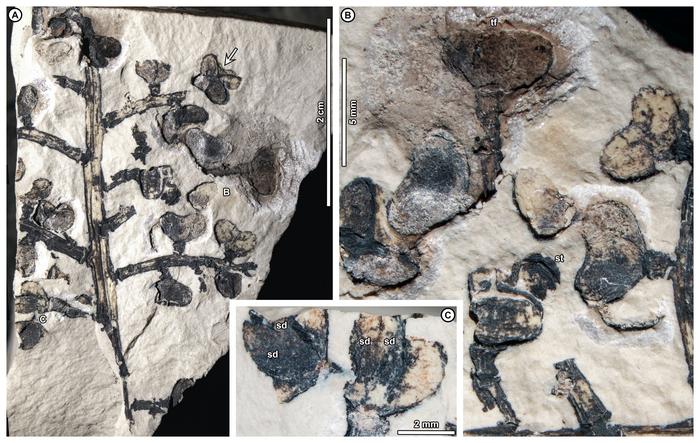 IMAGE: A 52-MILLION-YEAR-OLD COMPOUND INFRUCTESCENCE FOSSIL SHOWING PRESERVED FRUITS AND SEEDS ATTACHED TO BRANCHES, COLLECTED BY THE LATE RODOLFO MAGÍN CASAMIQUELA FROM LAGUNA DEL HUNCO, CHUBUT PROVINCE, ARGENTINA. THE PLANT'S CHARACTERISTICS — SUCH AS THE TERMINAL FRUIT (TF), AXILE SEEDS (SD) AND PLUMOSE STIGMA (ST) — ARE ONLY FOUND TODAY IN THE MACARANGA-MALLOTUS CLADE OF THE SPURGE FAMILY. view more