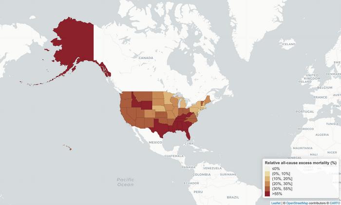 Peer-Reviewed PublicationIMAGE: THE RESEARCHERS CREATED AN INTERACTIVE MAP TO VISUALIZE COUNTY-LEVEL ESTIMATES OF EXCESS DEATHS MONTH-BY-MONTH. HERE, THE SNAPSHOT SHOWS THE NATIONAL VIEW IN SEPTEMBER 2021—THE DARKER THE COLOR, THE HIGHER THE EXCESS MORTALITY RATE. view more