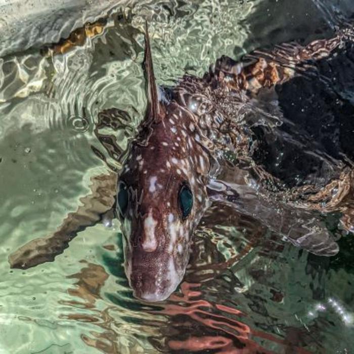 For example, chimaeras have big round eyes like a rabbit that allow them to see as they creep in the dark hunting for food. They have ever-growing tooth plates like a rodent, which is why they are often called ratfish. While shark skin is covered in teeth, chimaeras have no teeth on their skin, and the males have a giant bulb on their forehead called a tenaculum that grows spiky teeth that look like shark teeth.