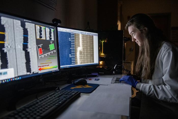 IMAGE: WEST VIRGINIA UNIVERSITY RESEARCHERS HAVE DEVELOPED A METHOD TO STANDARDIZE PROTOCOL FOR EXAMINING DUCT TAPE AND COMPARING PIECES OF TRACE EVIDENCE. PICTURED HERE IS CLAIRE DOLTON, A SENIOR STUDYING FORENSICS. view more