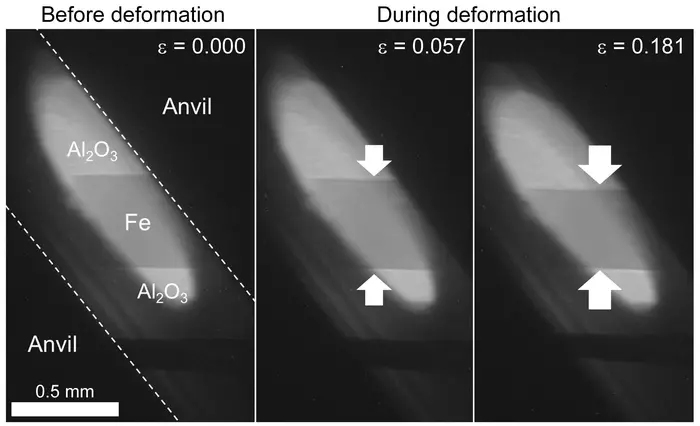 Peer-Reviewed PublicationIMAGE: X-RAY RADIOGRAPHIC IMAGES BEFORE AND DURING DEFORMATION EXPERIMENTS OF HCP-IRON AT 16.5-17.5 GPA AND 823-873 K. THE SAMPLE STRAIN DURING DEFORMATION WAS DETERMINED FROM THESE RADIOGRAPHS. view more