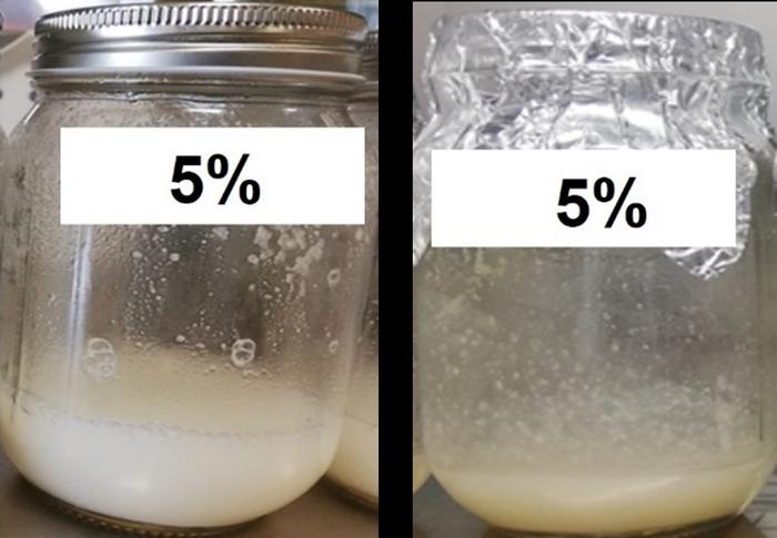 IMAGE: THIS BEVERAGE WITH 5% RICE FLOUR IN COCONUT WATER (LEFT) BECAME SLIGHTLY DARKER AND STICKIER AFTER BEING TREATED WITH HEAT (RIGHT). view more