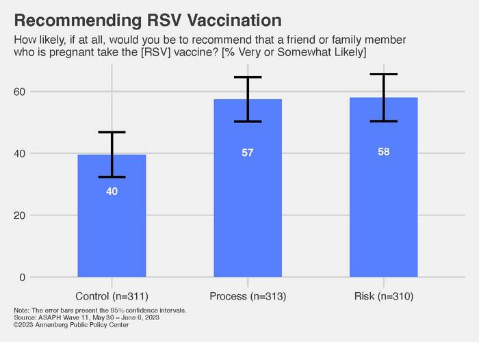 The experiment was conducted by an Annenberg Public Policy Center (APPC) team as part of a May 31-June 6, 2023, nationally representative panel survey on RSV, vaccination, and maternal health. Researchers found that 57% of those in a group exposed to a flowchart of the FDA vaccine approval process (see Appendix 1) were very or somewhat likely to recommend the RSV vaccine to a pregnant family member or friend, compared with 40% of those in a control group not shown the chart. Those in a third group, informed about the risks of RSV, were also more likely (58%) to recommend the vaccine (see graphic).