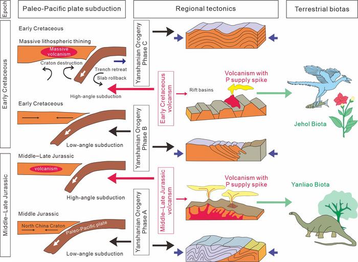 By analyzing the volcanic-sedimentary sequences in northern China, researchers have traced the changes in P delivery, biological productivity and species abundance over time. They have found that there were episodic increases in P supply, which coincided with periods of high biological productivity and species abundance. In addition, the younging trend of Jehol fossils is consistent with the migration of volcanism with increased volcanic P supply in northern China. These phenomena suggest that the elevated volcanic P supply from volcanic weathering to terrestrial ecosystems played a significant role in the Jehol Biota's success. The increased P supply was not a steady stream, however. Instead, it occurred in pulses, corresponding to the dynamics of Jehol Biota radiation.