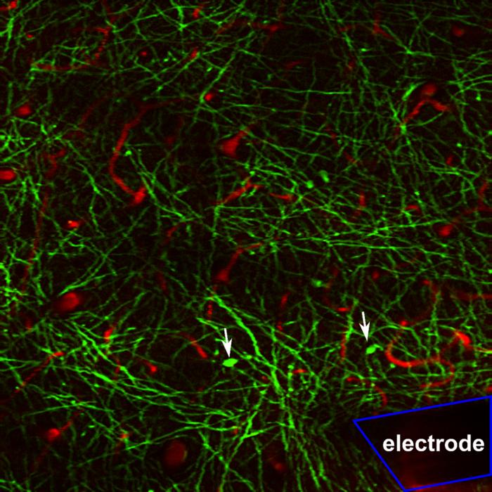 IMAGE: IMAGE OF OLIGODENDROCYTE AND MYELIN (GREEN) IN THE BRAIN NEXT TO AN IMPLANTED MICROELECTRODE. OLIGODENDROCYTE SOMAS ARE DENOTED BY WHITE ARROWS, BLOOD VESSELS ARE SHOWN IN RED, AND THE MICROELECTRODE SHANK IS OUTLINED IN BLUE. view more