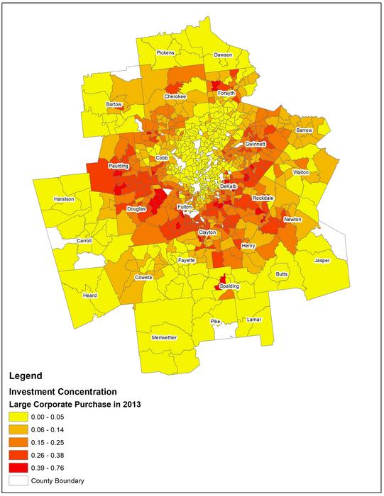 Using these methods and measures, An showed that, on average, neighborhoods experienced an increase of large investor purchases from nearly 0% in 2007 to over 12% in the peak year, 2013. Investors acquired up to 76% of for-sale, single-family homes in some neighborhoods.