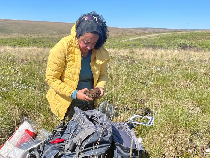IMAGE: ORNL’S FERNANDA SANTOS EXAMINES A SOIL SAMPLE AT AN NGEE ARCTIC FIELD SITE IN THE ALASKAN TUNDRA IN JUNE 2022. view more