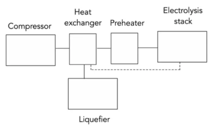 Finally, authors discuss the results and draw conclusions. As for the solid oxide electrolysis (SOXE) system, the electrochemical power is 14.6 kW for control option 1 and 4.87*FO2 kW for control option 2. The preheat power is estimated to be ~0.5 kW. The heat loss is approximately 0.35 kW, although it depends on atmospheric conditions. The total SOXE power for any control option is the sum of the electrochemical power, preheating power, and heat loss power. The runs for the various control options yield the results shown in Table 4. As for the compressor, the adiabatic efficiency is a function of inefficiencies of its components, including motor losses, seal friction, and bearing friction. Table 5 summarizes power requirements for compression in various control options. The rate of heat removal from the system by the cryocooler is calculated as the cooling required to lower the temperature of the gaseous oxygen to its boiling point and liquefy it. The result is shown in Table 6. Total power including all contributions is concluded in Table 7.