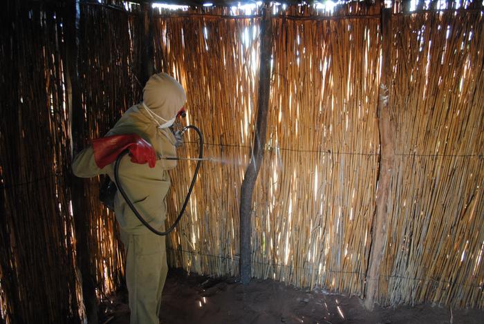 IMAGE: COURTESY OF KRIJN PAAIJMANS. AN EMPLOYEE OF THE NATIONAL MALARIA CONTROL PROGRAM IN MOZAMBIQUE SPRAYING INSECTICIDES ON WALLS INSIDE A HOME. view more