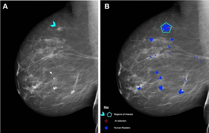 IMAGE: (A) RIGHT MEDIOLATERAL OBLIQUE UNADULTERATED MAMMOGRAM SHOWS AN 8-MM ILL-DEFINED MASS (ARROWHEAD), WHICH, AFTER BIOPSY, WAS DETERMINED TO BE A HISTOLOGIC GRADE 2 DUCTAL CARCINOMA OF NO SPECIAL TYPE. (B) MAMMOGRAM SHOWS FINDINGS BY HUMAN READERS (BLUE AREAS) AND THE LUNIT INSIGHT MMG ARTIFICIAL INTELLIGENCE (AI) ALGORITHM (RED CROSS). EACH BLUE DOT IS A MARK PLACED BY AN INDIVIDUAL HUMAN READER ON A PERCEIVED ABNORMALITY WHEN THE PERSONAL PERFORMANCE IN MAMMOGRAPHIC SCREENING (PERFORMS) CASE WAS READ. A REGION OF INTEREST (PENTAGON) HAS BEEN ANNOTATED BY THE PERFORMS SCHEME ORGANIZERS AND THEIR EXPERT RADIOLOGY PANEL. AI HAS CORRECTLY MARKED THE REGION OF INTEREST IN THE RIGHT BREAST FOR RECALL. SOURCE: PERFORMS VIA YAN CHEN. view more