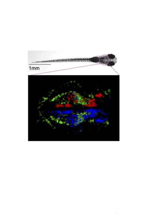 In the study, zebrafish were embedded in agarose, a gel-like substance, to keep them in a fixed position so that the researchers could image the brain. The agarose near their eyes and tails was removed to allow for movement. “We then put images on a screen below the zebrafish and recorded brain activity with a fluorescent dye through a microscope”, describes Feierstein.