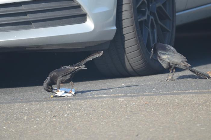 IMAGE: AN ADULT MALE GREAT-TAILED GRACKLE (RIGHT) WATCHES AS CUERVO (A JUVENILE MALE, LEFT) EXTRACTS FOOD FROM ITS CONTAINER AT A SHOPPING MALL PARKING LOT IN SACRAMENTO, CALIFORNIA. view more