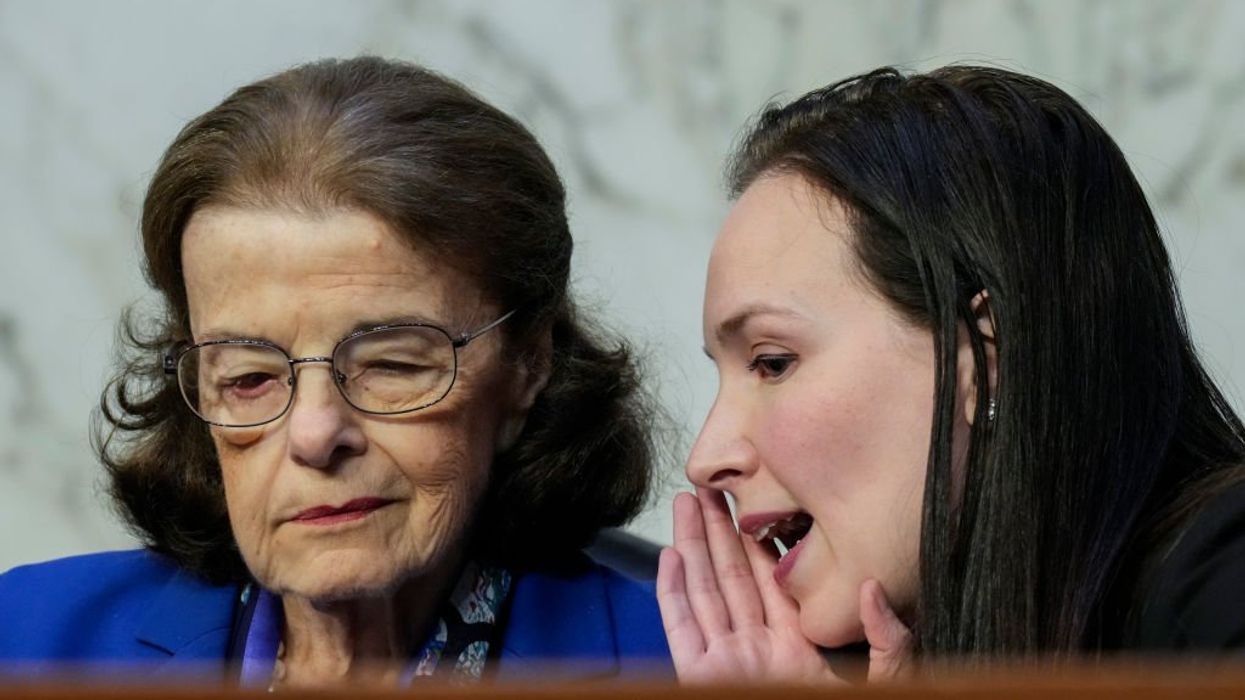 WASHINGTON, DC - MAY 11: Sen. Dianne Feinstein (D-CA) speaks with a staff member during a business hearing of the Senate Judiciary Committee on Capitol Hill May 11, 2023 in Washington, DC