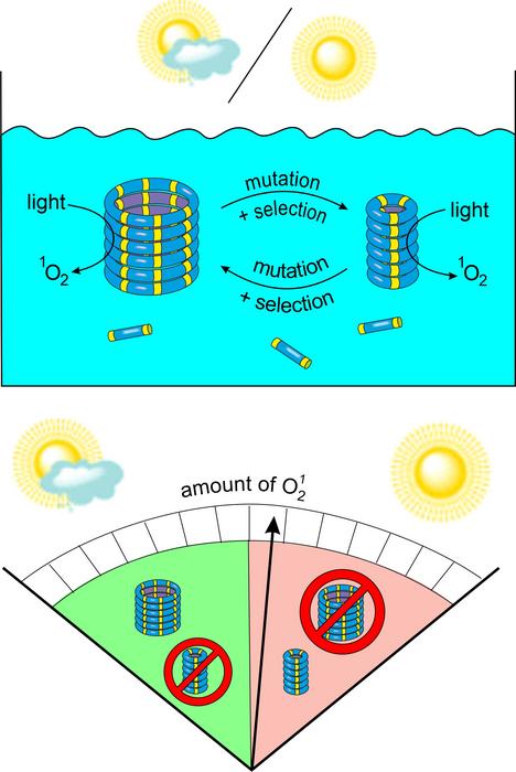 The researchers further developed this system by giving the replicators the ability to alter the oxidation state of their environment by themselves in response to light. Weak light conditions caused only little oxidation, allowing the 6-ring replicators to dominate. However, under strong light, the 6-ring replicators increased the oxidation level, thereby poisoning its own environment. This reduced the ability of this replicator to grow, and the mutant 3-ring fibres now took over.