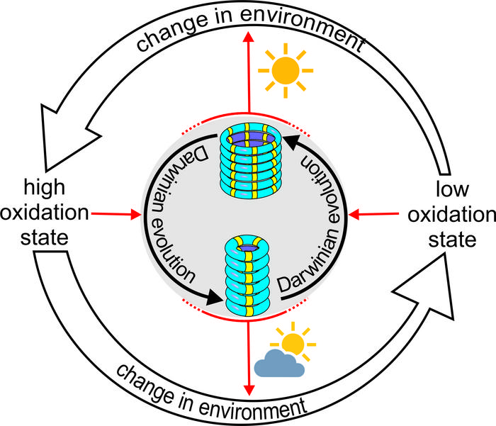 IMAGE: A POPULATION OF THE TWO MUTANTS CAN UNDERGO DARWINIAN EVOLUTION THROUGH MUTATION AND SELECTION, ADAPTING TO A CHANGE IN THE ENVIRONMENT CAUSED BY THE REPLICATORS THEMSELVES. THE TWO REPLICATOR MUTANTS, A SIX-RING AND A THREE-RING, COMPETE FOR A COMMON BUILDING BLOCK. BOTH REPLICATORS CAN PRODUCE SINGLET OXYGEN WHEN IRRADIATED WITH LIGHT, CAUSING A CHANGE IN THE OXIDATION STATE OF THEIR ENVIRONMENT. AT A HIGH OXIDATION STATE, THE HEXAMER CAN NO LONGER REPLICATE EFFICIENTLY, WHILE TRIMER REPLICATION STALLS AT A LOW OXIDATION STATE. THESE EFFECTS RESULT IN THE ADAPTATION OF THE REPLICATOR POPULATION TO A CHANGE IN OXIDATION LEVEL, WHICH, IN TURN, DEPENDS ON THE LIGHT INTENSITY. THIS BEHAVIOUR SHOWS THAT NATURAL SELECTION CAN ALSO ACT OUTSIDE BIOLOGY ON SYSTEMS OF MAN-MADE MOLECULES. view more