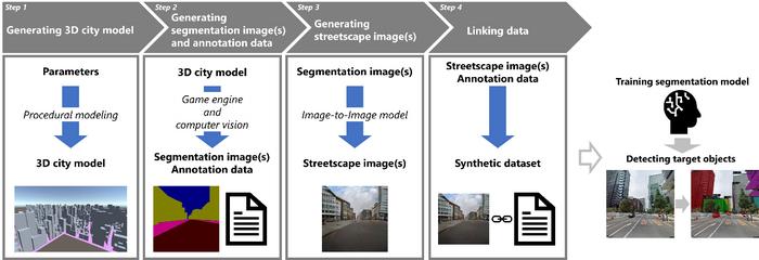 IMAGE: OVERVIEW OF THE PROPOSED METHOD. A 3D CITY MODEL IS AUTOMATICALLY GENERATED ACCORDING TO THE SPECIFIED PARAMETERS USING PROCEDURAL MODELING, AND ANNOTATION DATA AND TRAINING IMAGES ARE GENERATED FROM THE 3D CITY MODEL USING A GAME ENGINE AND AN IMAGE TRANSLATION TECHNIQUE, RESPECTIVELY. view more