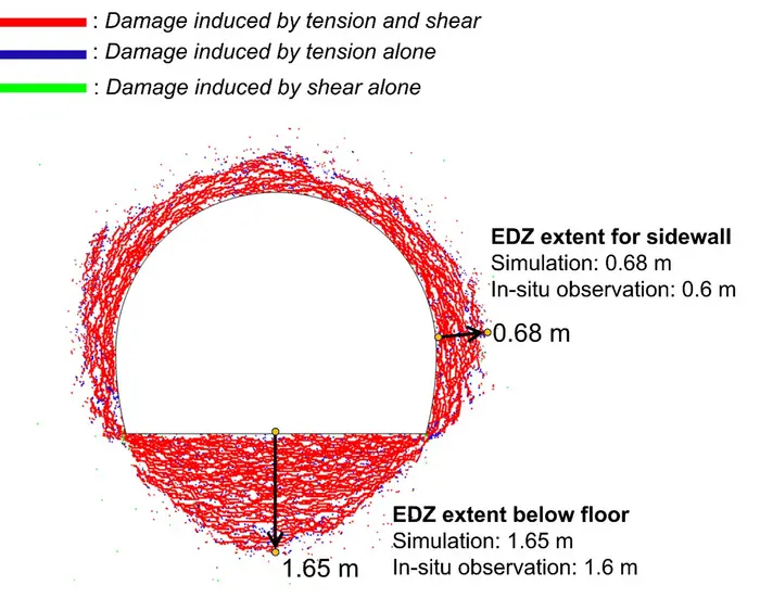 IMAGE: EXTENT OF SIMULATED EDZ AND DISTRIBUTIONS OF DAMAGE MODES AROUND NICHE AT END OF EXCAVATION ANALYSIS. view more
