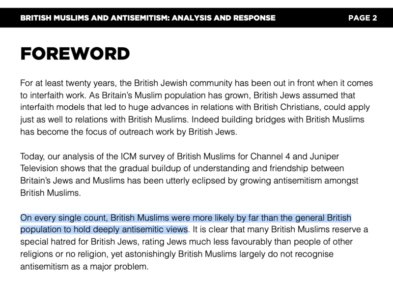 In a now deleted report, seen by The Electronic Intifada, chief executive Gideon Falter alleged that, “On every single count, British Muslims were more likely by far than the general British population to hold deeply anti-Semitic views.”
