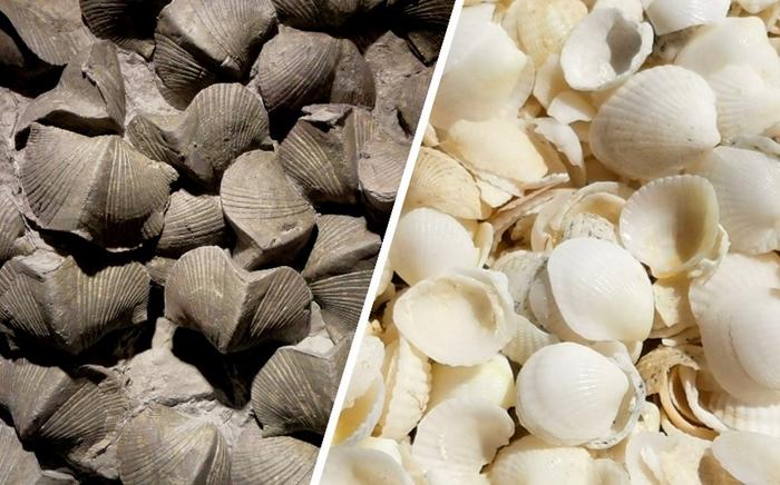 IMAGE: LEFT, DEVONIAN BRACHIOPOD FOSSILS FROM OHIO, USA. RIGHT, RECENT BIVALVE SHELLS FROM SHELL BEACH, WESTERN AUSTRALIA. view more