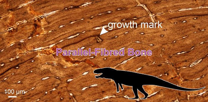 IMAGE: THE BLACK SILHOUETTE IS A ROUGH INDICATION OF WHAT BP/1/8484 WOULD HAVE LOOKED LIKE. IN THE BACKGROUND, A SAMPLE OF A MICROSCOPIC IMAGE SHOWING THE BONE STRUCTURE OF THE GIANT EARLY CROCODYLOMORPH FROM THIS STUDY. THE TYPE OF BONE TISSUE IS CALLED PARALLEL-FIBRED BONE. THE GROWTH MARK INDICATES WHEN THE ANIMAL STOPPED GROWING DURING THE UNFAVOURABLE GROWING SEASON. view more