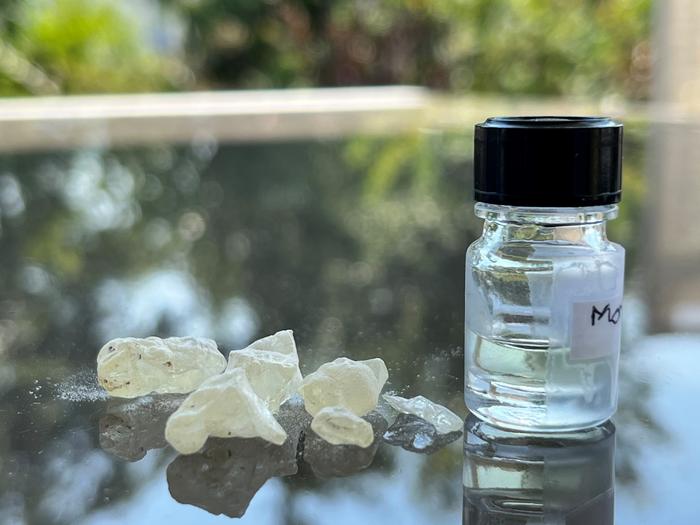 Dammar resin, an ingredient in embalming, next to a bottle of the ancient scent recreated by perfumer Carole Calvez based on scientific analyses