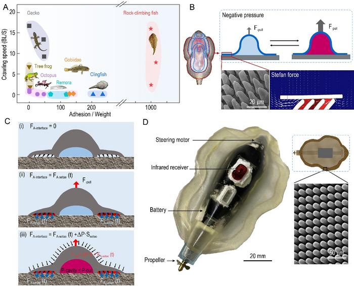 IMAGE: (A) AMONG THE ADHERING SPECIES, THE ROCK-CLIMBING FISH CAN GENERATE GREAT ADHESION FORCE WITH AMAZING CRAWLING ABILITY UNDERWATER. (B) THE SETAE ARRAY ON THE BROWN SHADED AREA CONFORMS TO THE SUBSTRATE AND FORMS A SEALING CHAMBER THROUGH THE STEFAN FORCE; THE INNER CAVITY OF THE SUCTION CUP IN THE BLUE AREA PRESENTS A PRESSURE CHANGE DUE TO THE VOLUME CHANGE WHEN THE PULL-OFF FORCE IS IMPOSED. (C) THE MECHANISM FOR GENERATING THE NEGATIVE PRESSURE ADHESION: UPON THE ACTION OF THE PULL-OFF FORCE, THE MICRO SETAE AT THE EDGE OF THE SUCTION CUP ARE KEPT IN CONTACT WITH THE SUBSTRATE BY FORCE “FA-SETAE” DUE TO THE HYDRODYNAMIC INTERACTIONS, AND THE SUCTION CUP KEEPS SEALED DURING THE PULL-OFF PROCESS. HOWEVER, THE SUCTION CUP DEFORMS TO INCREASE ITS VOLUME AND DECREASE ITS INNER PRESSURE TO GENERATE NEGATIVE PRESSURE ADHESION TO RESIST THE PULL-OFF FORCE THROUGHOUT THE PROCESS. (D) A BIONIC CRAWLING FISH NAMED CLIMBOT, AN UNDERWATER CLIMBING ROBOT WAS DESIGNED BASED ON THE ADHESION MECHANISM OF THE FISH, WHICH CAN CRAWL AT A MAXIMUM SPEED OF 3.7 BL/S AND HAS AN ADHESION FORCE OF 25.67 ± 2.81 N. view more