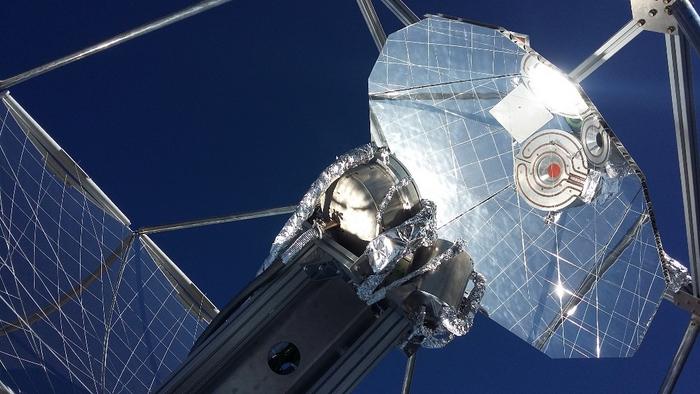 THE SUN-TRACKING PARABOLIC REFLECTOR DELIVERS CONCENTRATED SUNLIGHT TO A SOLAR REACTOR (SEEN VIA THE SECONDARY REFLECTOR) WHICH CONVERTS WATER AND CO2 EXTRACTED FROM THE AIR INTO A SYNGAS MIXTURE, WHICH IN TURN IS FURTHER PROCESSED INTO DROP-IN FUELS SUCH AS KEROSENE.