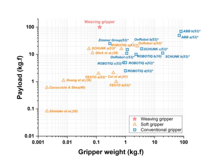 Comparison of gripper weight to payload (maximum weight the robot can lift) for the woven gripper, soft gripper, and rigid gripper