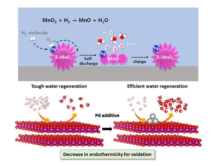 To cope with this critical issue, the research team has developed a composite catalyst consisting of manganese dioxide and palladium, which is capable of automatically converting hydrogen gas generated inside the cell into water, ensuring both the performance and safety of the cell. Manganese dioxide does not react with hydrogen gas under normal circumstances, but when a small amount of palladium is added, hydrogen is readily absorbed by the catalysts, being regenerated into water. In the prototype cell loaded with the newly developed catalysts, the internal pressure of the cell was maintained well below the safety limit, and no electrolyte depletion was observed.