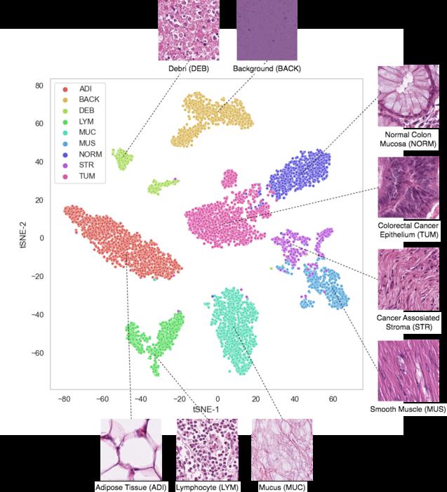 EACH DOT REPRESENTS AN IMAGE PIECE FROM A CANCER MICROSCOPE SLIDE. THE AI SYSTEM HAS AUTOMATICALLY ARRANGED THEM BY SIMILARITY.