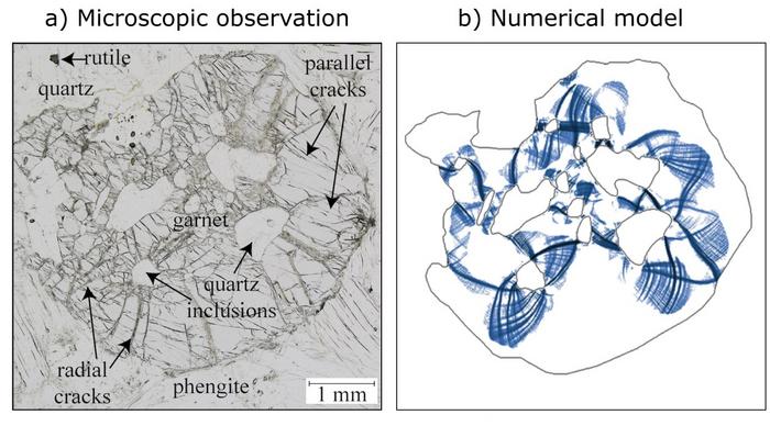 One of the pink garnet grains (left image, embedded in a matrix of quartz, rutile and phengite) with SiO2 inclusions (quartz inclusions), from which cracks originate. Numerical models (right image) predicts the generation of garnet failure.