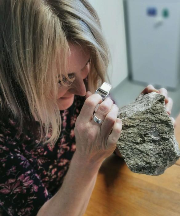 PROFESSOR LUCIE TAJČMANOVÁ, HEIDELBERG UNIVERSITY, EXAMINES THE WHITESCHIST SAMPLE FROM THE DORA MAIRA MASSIF OF THE WESTERN ALPS. PHOTO: SEBASTIAN CIONOIU, HEIDELBERG UNIVERSITY