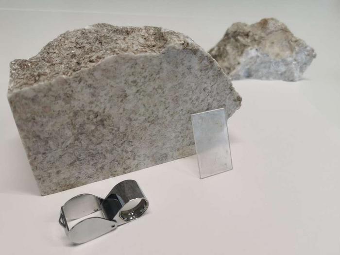 For the microscopic examination, a thin section of the whiteschist was glued to a glass slide (center of the picture).